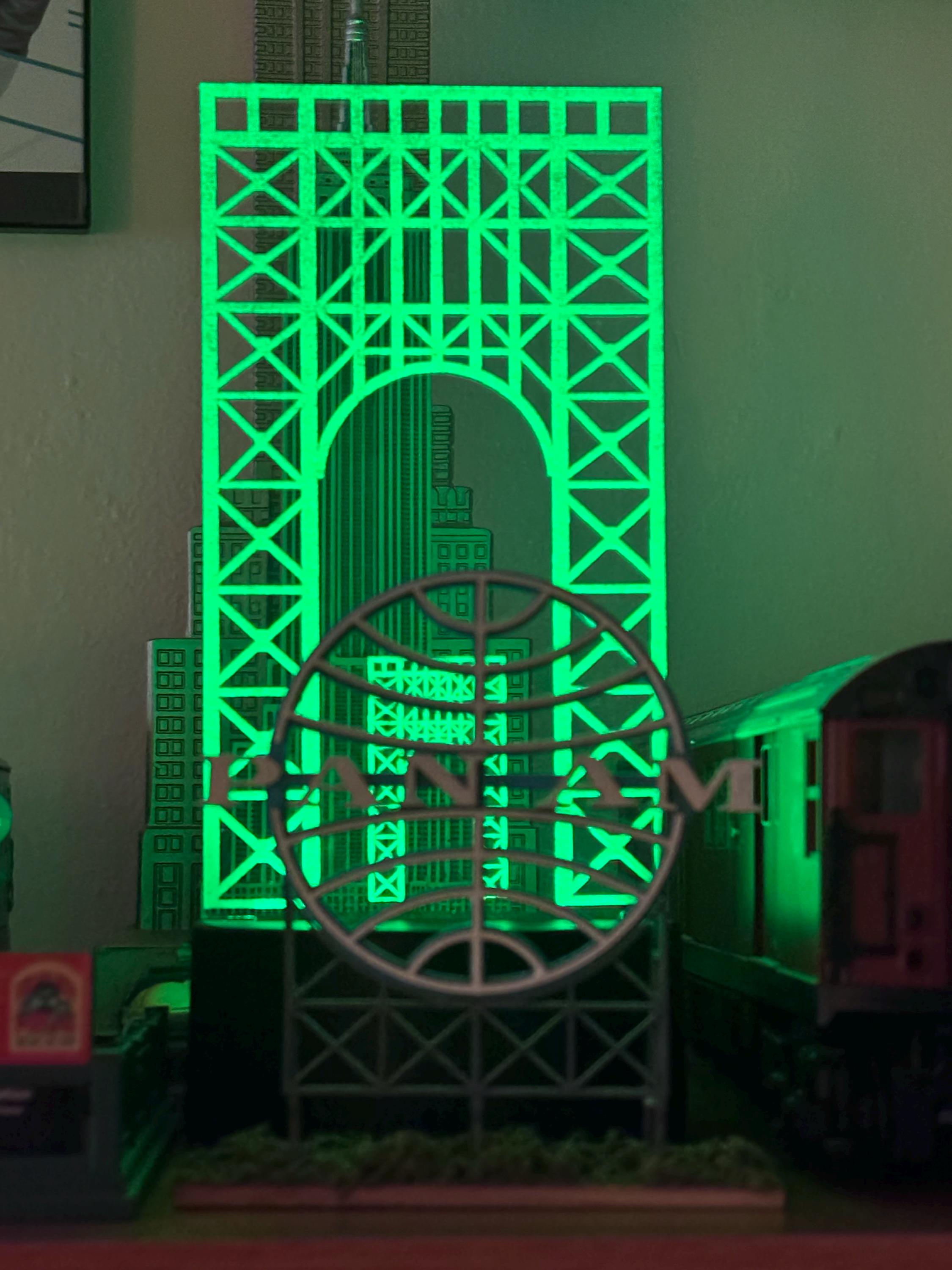 This LED light made from 1/8" acrylic is of the G.W. Bridge in Washington Heights which is the Northern part of Manhattan in NYC. This bridge connects Manhattan with Fort Lee in New Jersey. It makes for a nice nightlight for the kids or a shelf sitter for the adults. The Bridge started being built in October of 1927 and opened on October 25th 1931. The LED light base is included and has a remove to change to many colors. But this particular bridge is lite up on federal holidays in white so I use the white light (pictured). LED light comes with a cord to plug it in plus a remote to change colors and mode. It can also take 3 AA batteries if you so choose. There is also a power button on the base itself.